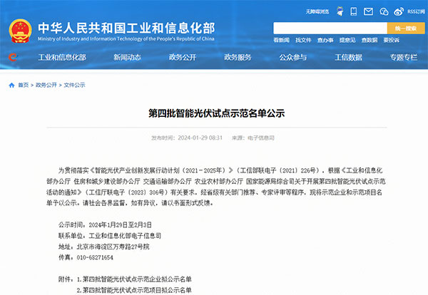 1月29日,工業和信息化部在官網發布了《第四批智能光伏試點示范名單公示》,作為全球光伏行業智能制造樣板和示范企業,通威太陽能金堂成功入列“智能光伏試點示范企業”公示名單,公示時間為2024年1月29日至2024年2月3日。