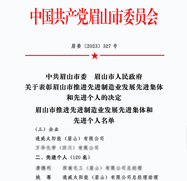 通威太陽能眉山基地及黨總支書記姚騫分別榮獲“眉山市推進先進制造業發展先進集體、先進個人”稱號
