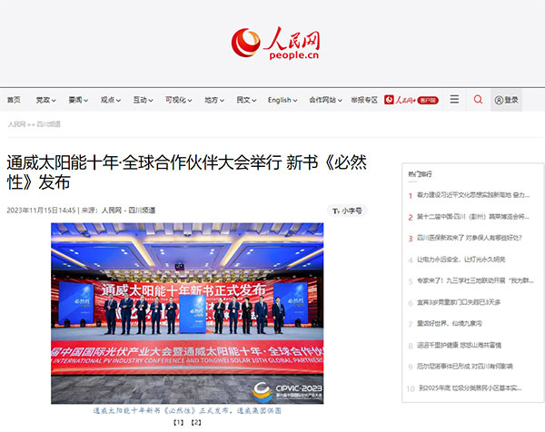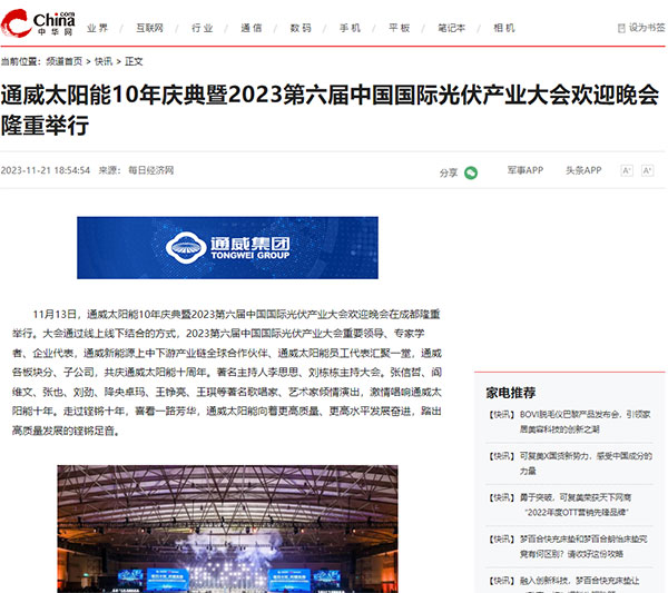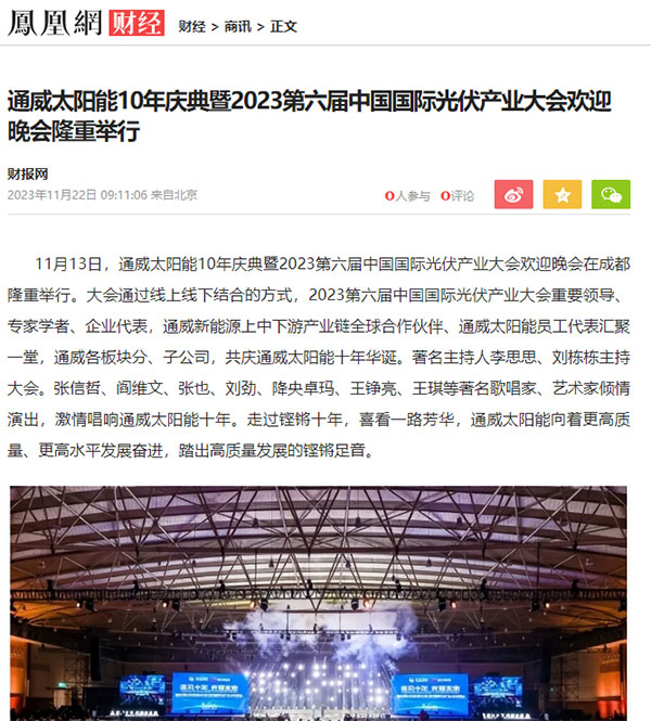 人民網、中華網分別聚焦通威太陽能十年·全球合作伙伴大會和通威太陽能10年慶典暨2023第六屆中國國際光伏產業大會歡迎晚會,報道了通威太陽能十年新書《必然性》的發布及慶典晚會的舉辦。同時,鳳凰網、和訊網、紅商網、索比光伏網等財經和光伏行業媒體也爭相報道通威太陽能十年盛典事宜,彰顯了通威太陽能強勁的發展實力和行業影響力。