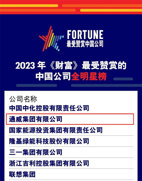 11月21日,《財富》最受贊賞的中國公司榜單正式發布,通威榮列榜單,位列第43位。《財富》最受贊賞的中國公司榜單是中國公司“軟實力”的晴雨表,此次入圍榜單,彰顯了通威強勁的發展實力,以及品牌知名度、美譽度,行業影響力、話語權的不斷提升與突破,讓世界看見中國光伏品牌力量。