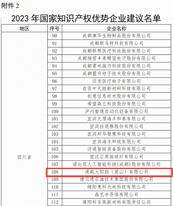 1113日,國(guó)家知識(shí)產(chǎn)權(quán)局發(fā)布了《關(guān)于2023年度國(guó)家知識(shí)產(chǎn)權(quán)優(yōu)勢(shì)企業(yè)和示范企業(yè)評(píng)定結(jié)果的公示》,通威太陽(yáng)能眉山基地憑借卓越的知識(shí)產(chǎn)權(quán)實(shí)力,成功獲評(píng)國(guó)家知識(shí)產(chǎn)權(quán)優(yōu)勢(shì)企業(yè)