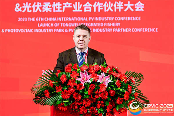 通威新能源總部綜合部部長唐霖,澳大利亞駐成都總領事館副總領事,澳大利亞貿易投資委員會商務專員Paul Cheyne,中南大學本科生院院長何旭輝,通威新能源工程設計四川有限公司市場開發部總監翁曉軍分別帶來《“光伏+漁業”應用模式發展趨勢》《澳大利亞光伏政策和市場分享》《柔性支架技術及行業發展前景講解》《通威柔性技術及發展》主題演講。