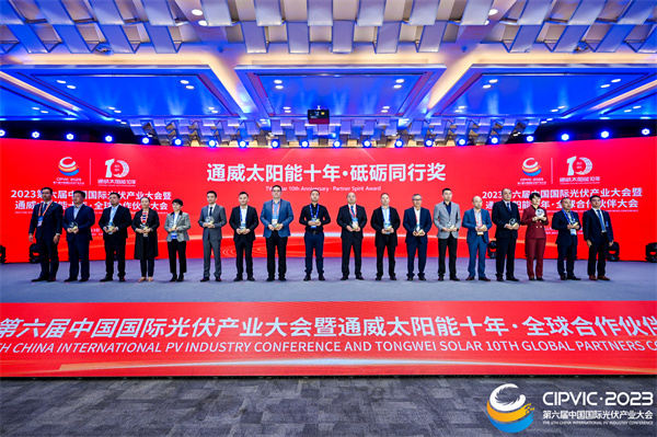 過去十年,通威太陽能的成長和發展,離不開光伏同行的鼎力相助和合作伙伴的大力支持。在成立之初,通威太陽能就把與供應商、客戶的合作共贏放在第一位。大會特別頒發砥礪同行獎、通力合作獎、同舟共濟獎。