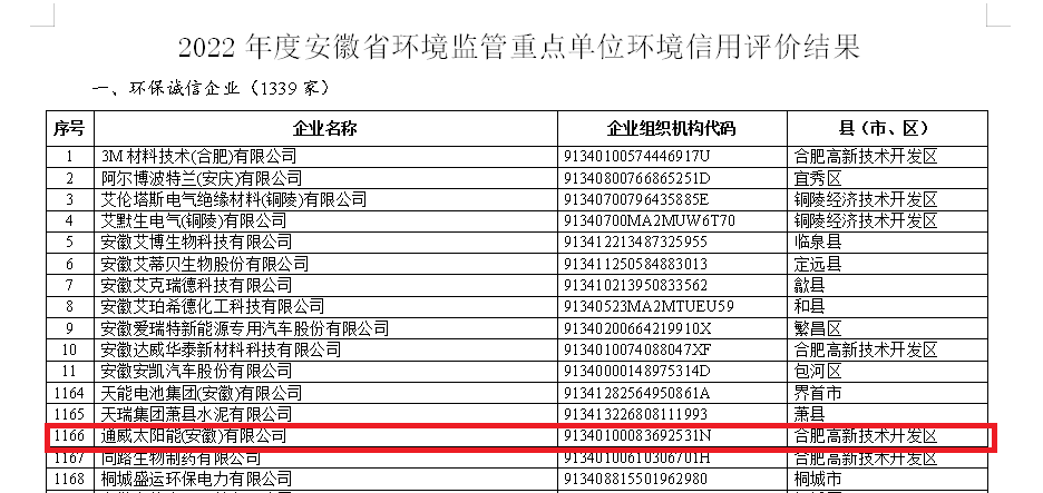 近期,安徽省生態環境廳發布了關于2022年度安徽省環境監管重點單位環境信用評價結果的公告,通威太陽能安徽公司榮列2022年安徽省環保誠信企業榜單。