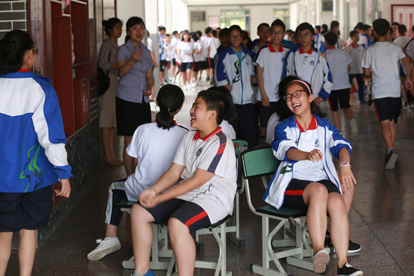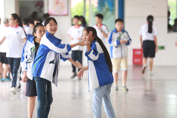 這天恰逢六一兒童節(jié),學(xué)校開展了游園活動(dòng)。初一學(xué)生和老師在一起玩游戲,其樂融融。