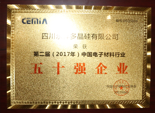 6月6日,中國電子材料行業協會六屆四次理事會、2017年行業發展報告會、電子材料行業50強企業發布會在江蘇省邳州市如期召開,永祥多晶硅喜獲第二屆(2017年)中國電子材料行業協會50強企業、第二屆(2017年)中國電子材料行業協會半導體材料專業十強企業兩個獎項。