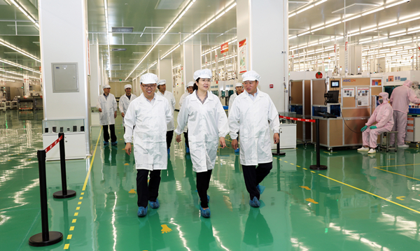隨后,考察團一行實地參觀了通威太陽能(成都)有限公司S1電池車間,詳細了解了通威太陽能電池片的生產工藝流程、產能情況和設備使用情況。考察團一行對S1車間高效的現(xiàn)場管理和高度自動化的設備設施給予了高度評價,希望蘇川兩省共同努力,將區(qū)域協(xié)同發(fā)展推向更深層次、更高水平。