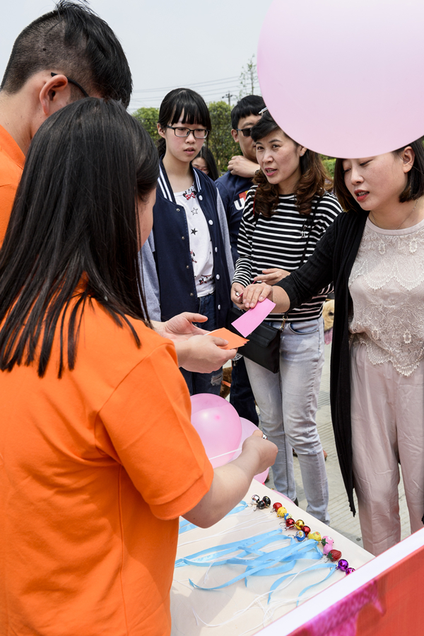 相親配飾秀環(huán)節(jié),由主人替犬只挑選鈴鐺配飾,總共12對(duì)犬只成功配對(duì),其中不乏金毛與巨型貴賓的強(qiáng)強(qiáng)組合、金毛與小泰迪的最萌身高差組合,但是仍舊有犬只落單,所謂“關(guān)愛單身狗人人有責(zé)”,成都好主人寵物食品為配對(duì)成功的犬只頒發(fā)了同款情侶三角巾后,也特別為落單的六只單身汪送出了關(guān)愛禮品————驅(qū)蚤花露水。雖然落單,但主人及犬只臉上卻絲毫沒有不開心的表情。