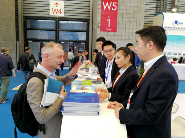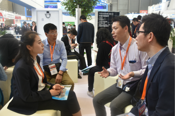 通威集團禚玉嬌總裁與永祥股份財務總監(jiān)周斌在通威展臺交流