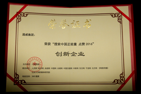 2月16日,在中央網(wǎng)信辦指導(dǎo)下,由中國搜索主辦,人民網(wǎng)、新華網(wǎng)、中新網(wǎng)等十余家國家級網(wǎng)絡(luò)媒體聯(lián)合舉辦的大型網(wǎng)絡(luò)宣傳活動頒獎典禮--“搜索中國正能量點贊2016”在新華社大禮堂隆重舉行。400余位媒體人士、獲獎嘉賓、企業(yè)及公益組織代表齊聚一堂,共同見證這一榮耀時刻。通威集團北京代表處主任李競受邀出席典禮并代表領(lǐng)取“創(chuàng)新企業(yè)獎”榮譽獎項。