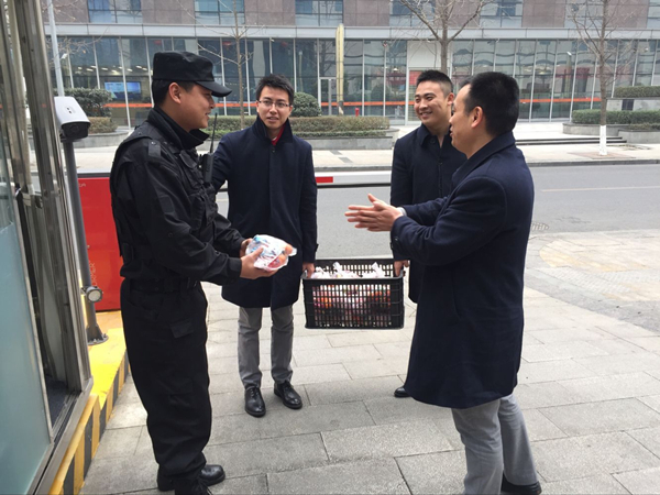 通宇物業公司總經理助理何黎明、李俊,向春節值班人員送去劉漢元主席,管亞梅董事長的問候和祝福