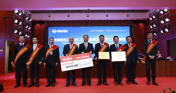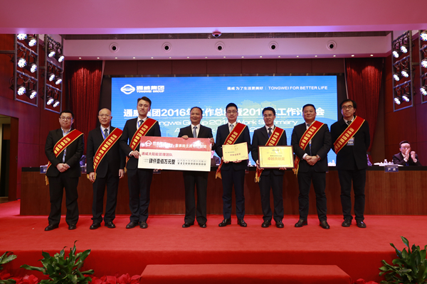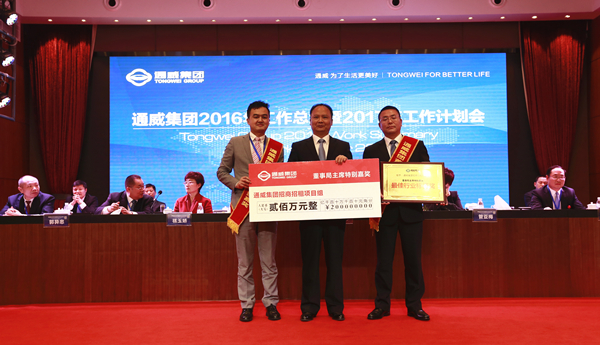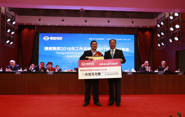 在集團年度表彰環節,“2016通威‘融合、變革、創新’十佳分子公司”、“2016通威年度英雄團隊”、“通威集團董事局主席特別嘉獎”等年度重磅獎項一一出爐,將大會現場的氣氛推上了一波又一波的高潮,現場共頒發了近7000萬獎金。
