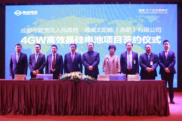 1月22日,成都市雙流區政府、通威太陽能(合肥)有限公司4GW高效晶硅電池項目簽約儀式在通威國際中心隆重舉行,項目預計總投資約50億元人民幣。成都市雙流區委書記周先毅,雙流區委副書記、區長徐剛,雙流區委常委、區總工會主席韓超,雙流區副區長、西開區管委會黨工委書記、主任曾虎,雙流區副區長劉偉及區相關部門負責人出席簽約儀式。十一屆全國政協常委、通威集團董事局劉漢元主席,通威集團禚玉嬌總裁、通威股份嚴虎副董事長,通威股份郭異忠總裁、通威集團監事會主席陳星宇、通威集團副總裁胡榮柱、通威太陽能(合肥、成都)有限公司董事長謝毅等通威高管出席簽約儀式。
