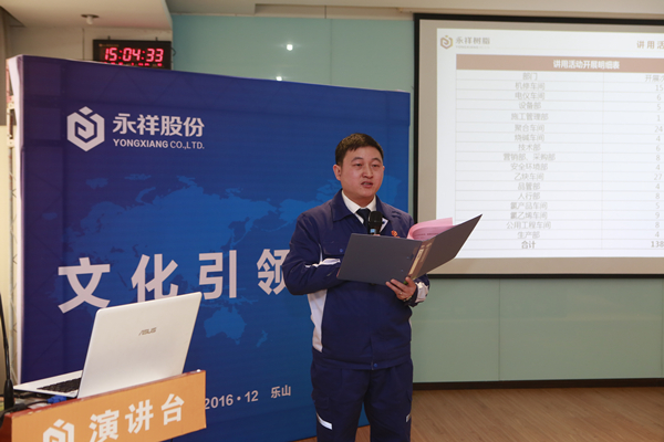 大會上,段雍董事長首先對永祥股份2016年企業文化建設工作進行總結,他指出,2016年永祥股份組建了71個講用文化團隊,總共開展講用活動近500場次,包括“我的崗位我負責,我的工作請放心”、“到現場發現問題,到現場解決問題”、“解決問題不解釋問題,推動工作不推諉工作”、“走出去請進來,集眾家所長于我身”、“觀念不變原地轉,觀念轉變天地寬”等,取得了良好成果,產生了因工作而導致指紋磨損的邱波、通過嚴格訓練成為集團企業文化辯論大賽最佳辯手的黃港、工作10個月就發表90多篇通訊稿的帥君君、還有多晶硅“拼命三郎”胡小兵、號稱樹脂“超能力”的周建勇等300余名積極分子。段董事長表示,在2016年,永祥股份獲得了“四川省優秀民營企業”稱號,永祥股份、永祥水泥獲得了“環保良好企業”榮譽,永祥多晶硅獲得了“樂山市政府質量獎”等多項榮譽,通過大家的齊心協力,公司打造出行業領先的創新能力、產品質量和成本優勢,樹立起良好的企業品牌形象。
