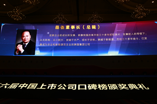 劉主席表示,未來(lái)30年是中國(guó)質(zhì)的飛躍的30年,通威將在綠色水產(chǎn)品、健康水產(chǎn)品和綠色能源、霧霾消除方面,做出自己的努力和貢獻(xiàn),我們將像今天獲獎(jiǎng)一樣,感到特別驕傲和特別自豪。通威集團(tuán)副總裁黃其剛?cè)膛阃鱿?016第五屆中國(guó)上市公司領(lǐng)袖峰會(huì)及2016第六屆中國(guó)上市公司口碑榜頒獎(jiǎng)盛典。