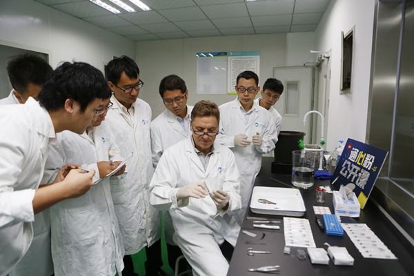 交流期間,布克曼教授就“魚類小瓜蟲病綜合防治技術(shù)研發(fā)和應(yīng)用”、“全球水產(chǎn)品生產(chǎn)帶來的疾病挑戰(zhàn)”等問題與動保所技術(shù)人員進(jìn)行了深入研討,并參觀了依托通威股份建立的國家級工程實(shí)驗(yàn)室————水產(chǎn)養(yǎng)殖動物疾病防控國家地方聯(lián)合工程實(shí)驗(yàn)室。布克曼教授對實(shí)驗(yàn)室的建設(shè)情況及研究成果給予了高度肯定,并表示希望通威能與哥本哈根大學(xué)強(qiáng)強(qiáng)聯(lián)手,一起攻克疑難魚病。