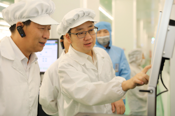 謝毅董事長向邵文祥副書記介紹電池片生產工藝流程