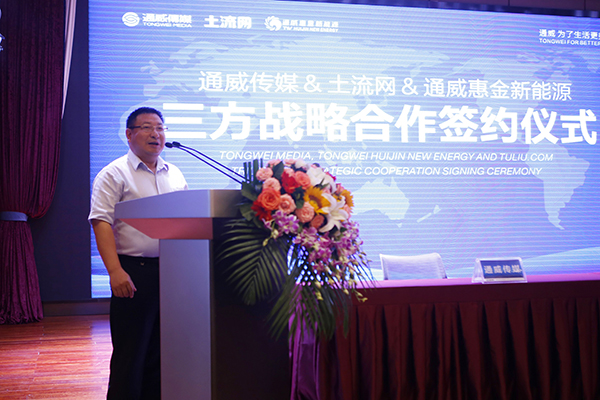簽約儀式上,土流網創始人兼CEO伍勇、通威惠金新能源有限公司總經理馮德志、通威傳媒總經理甘曉飛先后發言。伍總介紹道,土流網通過互聯網信息技術應用,將閑置的土地資源充分利用,大大提高了土地綜合效益,目前土流網注冊用戶約為84萬,擁有157家線下土地流轉中心,發布3.4億畝土地,成交9600萬畝。伍總表示,劉主席及通威“漁光一體”項目的創新性令人驚嘆,其“養殖+發電”的綜合效益將提高數倍以上,對于拉動農村地方經濟快速發展具有十分重要的意義。土流網希望可以結合自身所長,在土地流轉方面與通威集團深度合作,讓“漁光一體”項目惠及千家萬戶,共同實現“為了生活更美好”的宏偉愿景。