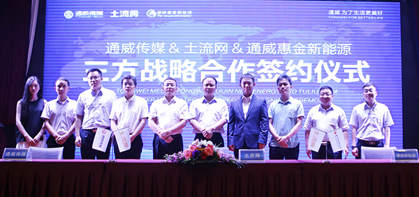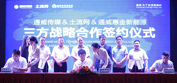 隨后,在劉漢元主席、副總裁黃其剛、通威惠金新能源有限公司總經理馮德志、土流網創始人兼CEO伍勇等領導的共同見證下,通威傳媒總經理甘曉飛、通威惠金新能源有限公司副總經理賴永斌、土流網聯合創始人兼副總裁陶慧龍代表三方現場簽署了合作協議。