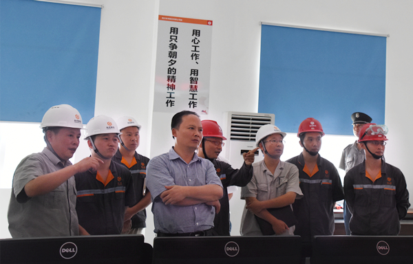 在永祥樹脂中控室,劉漢元主席察看設(shè)備運(yùn)行情況