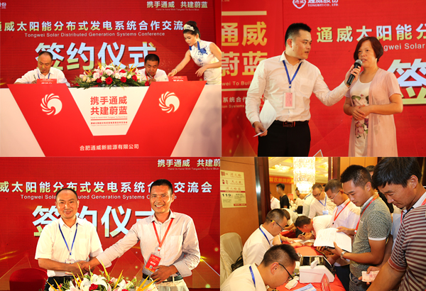 通過交流會上的經驗分享及互動,參會來賓對分布式發電系統的發展前景及合作方式有了更加充分的了解。來自傳統養殖、礦業、物流、國際貿易等各行各業的合作伙伴躊躇滿志,表現出強烈的合作意愿。在隨后舉行的簽約儀式上,現場成功達成了2048千瓦的約定安裝量。以此次會議為契機,通威新老合作伙伴在全國農村、城鎮推廣太陽能分布式中小型家庭發電站上邁出了堅實一步。