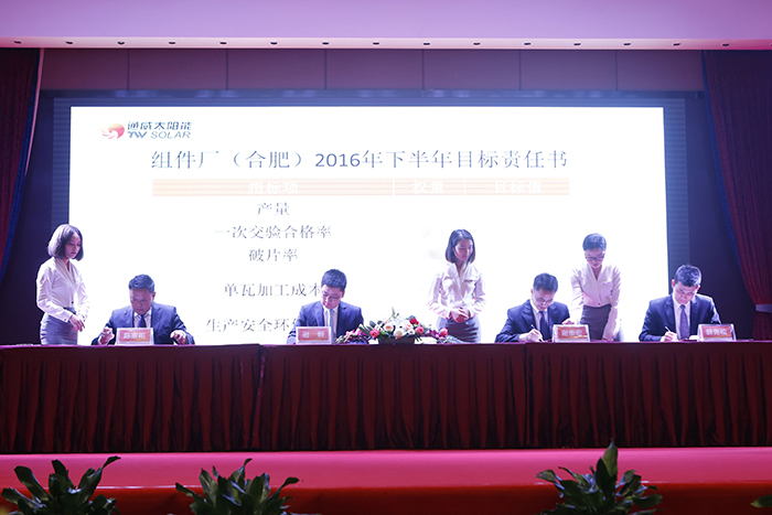 會議上,通威太陽能(合肥、成都)有限公司首席財務官周丹、高級副總裁張忠文、高級副總裁路廣軍首先從各自分管的部門工作出發(fā),結合市場競爭現(xiàn)狀,總結了上半年取得的成績,強調(diào)了下半年努力的方向和期望達成的目標。通威太陽能(合肥、成都)有限公司首席運營官謝泰宏、高級副總裁陳家彬、高級副總裁張冠綸、采購部部長薛青松分別就產(chǎn)供銷和研發(fā)體系進行了總結計劃述職。隨后,產(chǎn)供銷三個系統(tǒng)分別與謝董事長簽訂了下半年年度目標責任書。