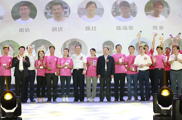2015年9月20日通心粉之夜晚會(huì)上,四川省陳文華副省長(zhǎng)、集團(tuán)劉漢元主席和20名“最美通心粉”合影