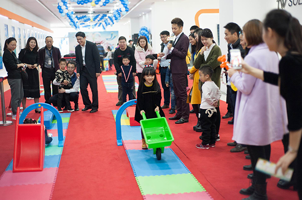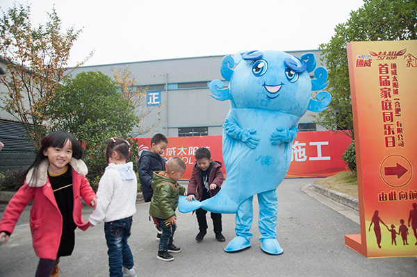 經過兩周時間緊羅密鼓的籌備工作,11月21日當天,通威太陽能(合肥)公司廠區內外裝飾一新,門口氣球高懸,落地桁架、指示牌、鮮花路引等營造出熱情活潑的整體氛圍。下午1點30分,載著員工家屬的大巴車徐徐駛入廠區。一組組家庭在小通仔的引領下走向家庭同樂日主會場。別致的蝴蝶Logo簽到墻、小通仔合影、精致的冷餐美食、游樂場般的活動場地……讓各家寶貝們興奮地蹦蹦跳跳。