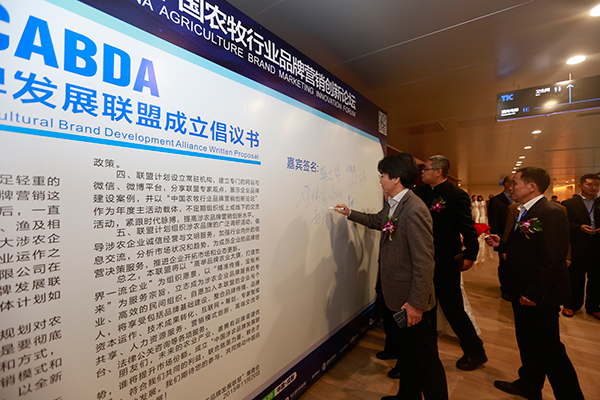 參會(huì)嘉賓在“中國(guó)涉農(nóng)品牌創(chuàng)新聯(lián)盟”成立倡議書上簽名