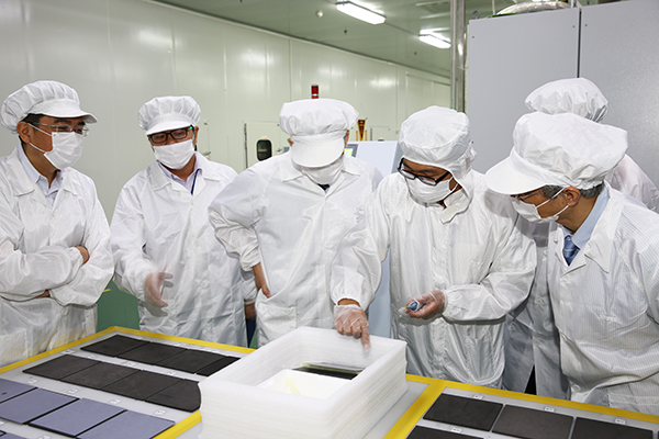 劉副總一行首先參觀了P1、P2電池生產車間,并對車間整體布局、自動化程度及現代化過程傳遞窗口給予高度評價。接著,劉副總一行進入刻蝕工序車間,現場觀摩了PID親水測試,詳細了解了石墨舟的清洗、維護、開裝精細度等情況。