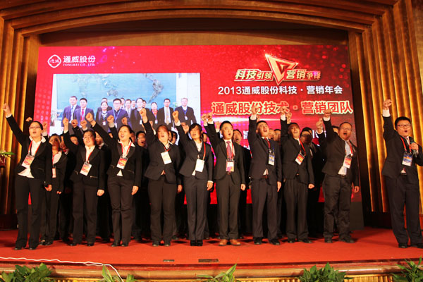 12月5日-8日,以“科技引領 營銷爭鋒”為主題的2013年通威股份科技·營銷年會在成都錦江賓館隆重召開。通威集團董事局劉漢元主席,通威股份嚴虎總裁,副總裁、市場營銷總監兼技術總監王尚文及管理總部各職能部門負責人,股份各分、子公司總經理與所轄市場系統相關人員近700人齊聚一堂,共襄年度盛典。