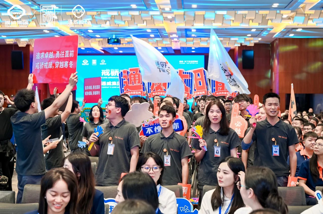 當天,通威集團管亞梅董事長,通威股份董事長、CEO劉舒琪,四川廣播電視臺十佳主持人楊旭 、劉波林、田川、劉源、宋晨,成都電視臺主任播音員袁莉,成都電視臺金牌主持人趙亮、王安冉,通威股份農牧總裁、通威農發總經理郭異忠,通威集團副總裁胡榮柱,通威集團黨委書記、副總裁、集團企業文化建設專項工作小組執行組長黃其剛,通威股份副總裁、永祥股份總經理李斌,通威股份光伏首席技術官邢國強,通威集團財務總監肖吉華,通威股份總裁助理、通威太陽能科技總經理蕭圣義,通威集團黨委組織委員、通威股份人力資源總監易繼成,集團企業文化建設專項工作小組執行副組長、通威股份行政總監馮暢,通威股份金融總監邱艾松,通威太陽能總經理周華,通威食品總經理陳波等領導,以及璉升光伏等川聯光伏產業商會部分會員企業嘉賓出席大會。通威集團管理總部、通威股份管理總部、通威農發、永祥股份、通威太陽能、通威太陽能科技、通威新能源、通威食品、通威地產、通威微電子、好主人寵物食品、通宇物業、通威傳媒、通威商管等600余人現場參會,全球通威人通過線上直播觀看大會盛況。